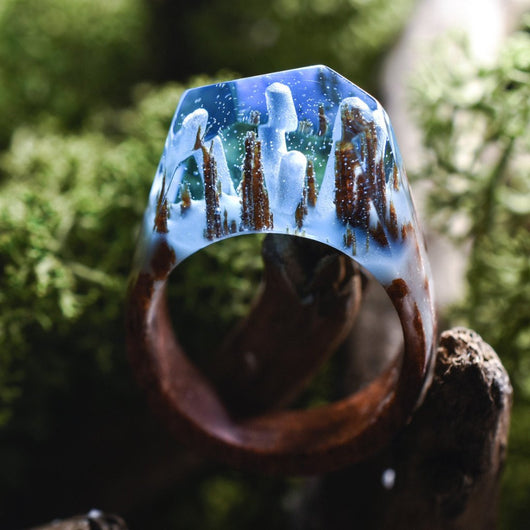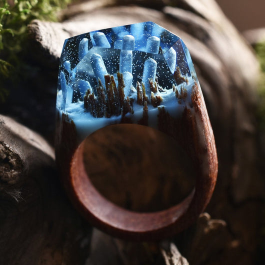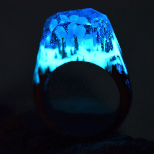 This ring is made of light blue resin and white “snow” that glows in the dark. The base is a red balau wood, a dense and incredibly strong wood.