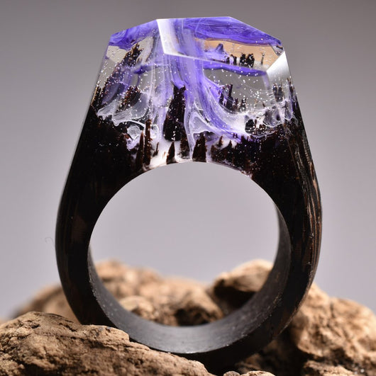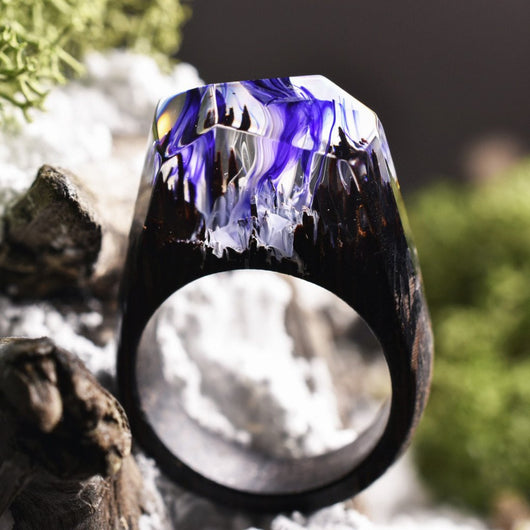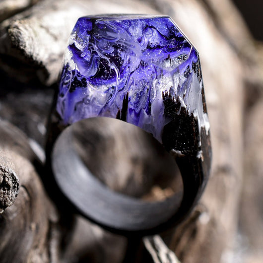 This ring is made of purple and clear resin. The base is wenge wood, a tropical timber which is both heavy and hard.