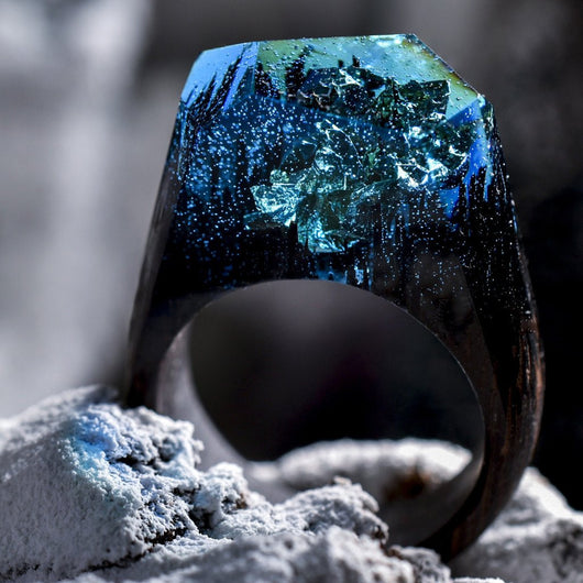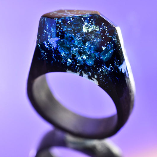 This ring is made of blue resin and flakes of real gold. The base is wenge wood, a tropical timber which is both heavy and hard.