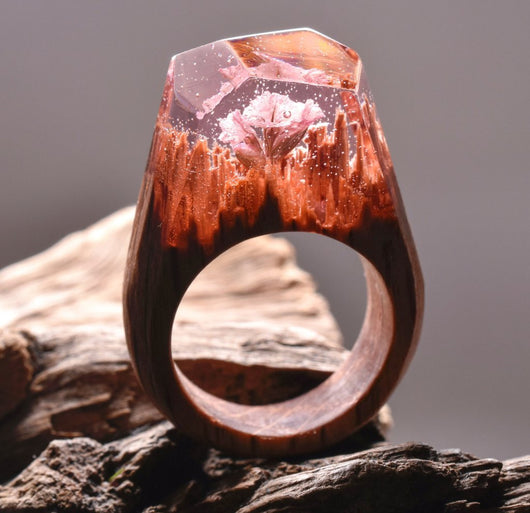This ring is made of light pink resin and pink blossoms. The base is a light oak wood, a dense and incredibly strong wood.