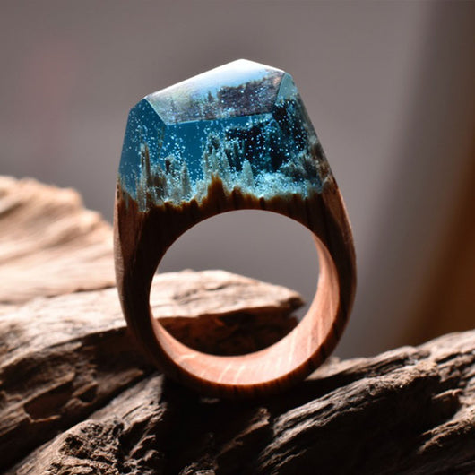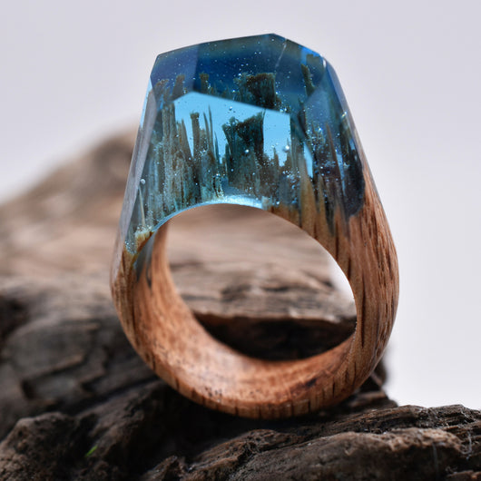 This ring is made of light blue resin. The base is a light oak wood, a dense and incredibly strong wood.