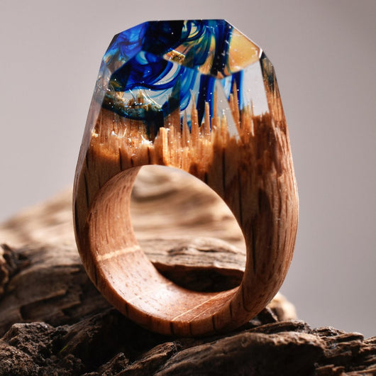 This ring is made of clear resin with a touch of cobalt blue. The base is a light oak wood, a dense and incredibly strong wood.