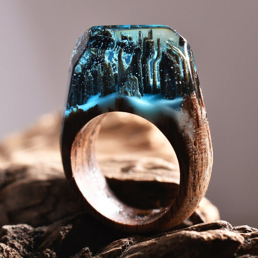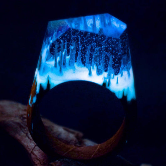 This ring is made of light blue resin and white “snow” that glows in the dark. The base is a light oak wood, a dense and incredibly strong wood.