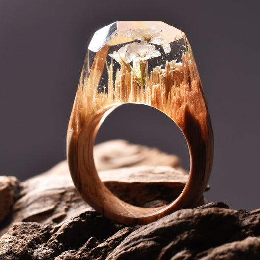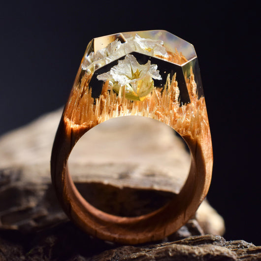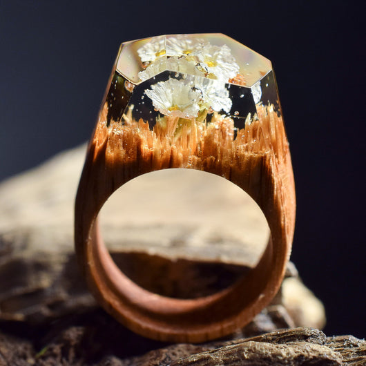 This ring is made of clear resin and white blossoms. The base is a light oak wood, a dense and incredibly strong wood.