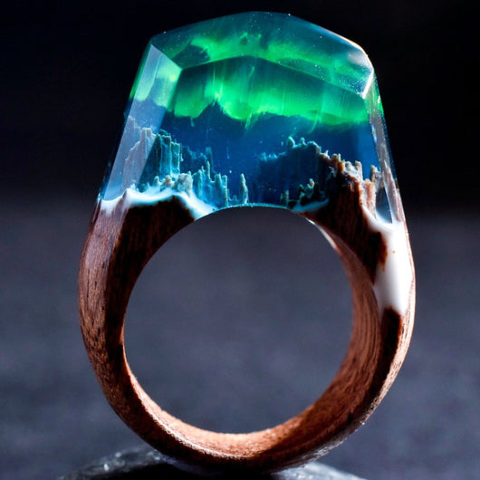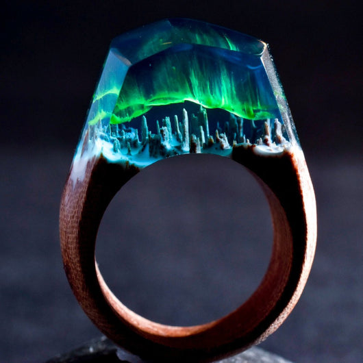 This ring is made of grey blue resin with green auroras. The base is sapele wood, a strong tree native to tropical Africa.