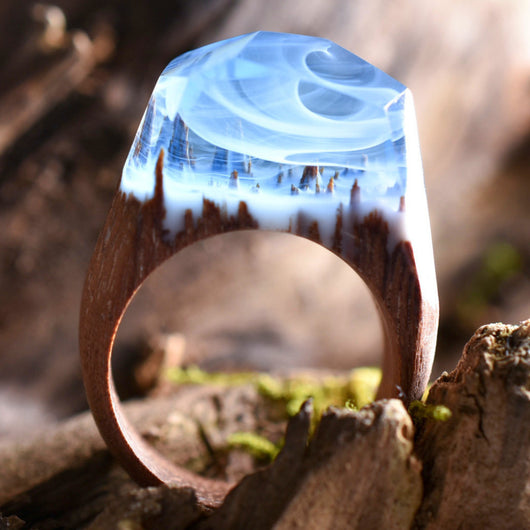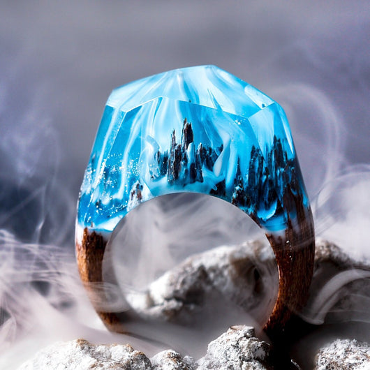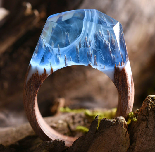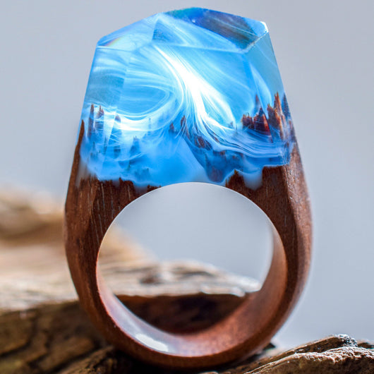 This ring is made of light blue and white resin. The base is sapele wood, a strong tree native to tropical Africa.